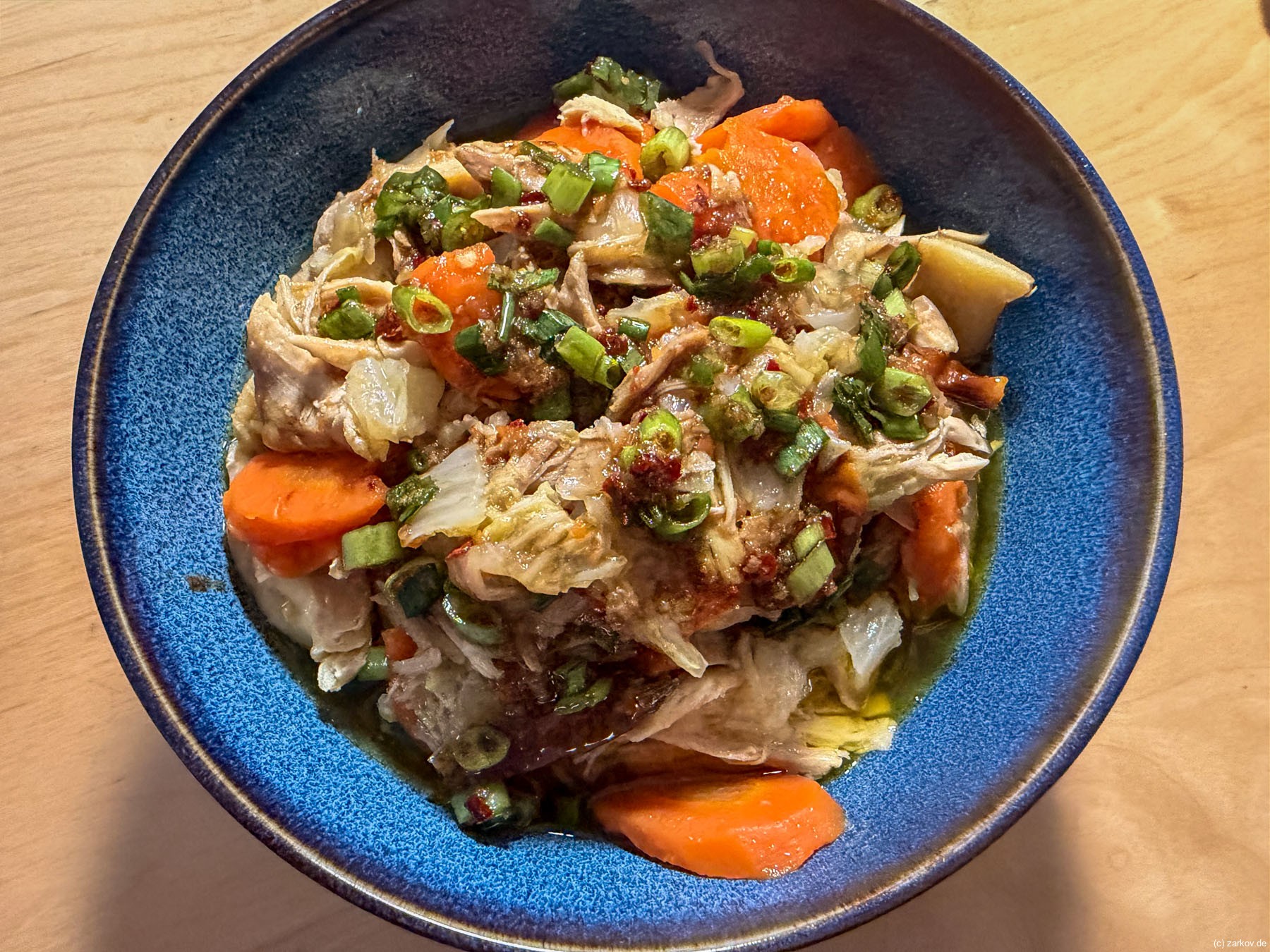 Den Chinakohl in grobe Stücke schneiden und in einen Topf geben. Die in Scheiben geschnittene Karotte oben drauf verteilen, ebenso die in Spalten geschnittene Zwiebel. Dann noch die Ingwerscheiben drauflegen und die Chilischoten. Das alles wird nun leicht gesalzen, aber nicht umgerührt. Nun werden die von beiden Seiten gute gesalzenen Hühnerschenkel oben drauf gegeben.